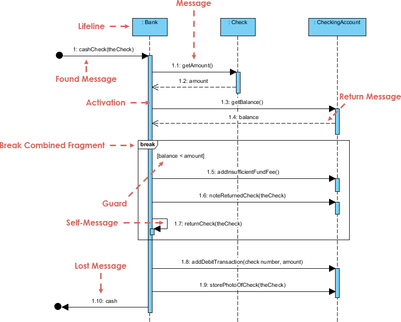 उपरोक्त संक्षिप्त चरणों का उपयोग करके, हम संदेशों के क्रम को जनरेट करते हैं और कभी-कभी स्पष्टता के लिए एक्टिवेशन बार शामिल करते हैं।