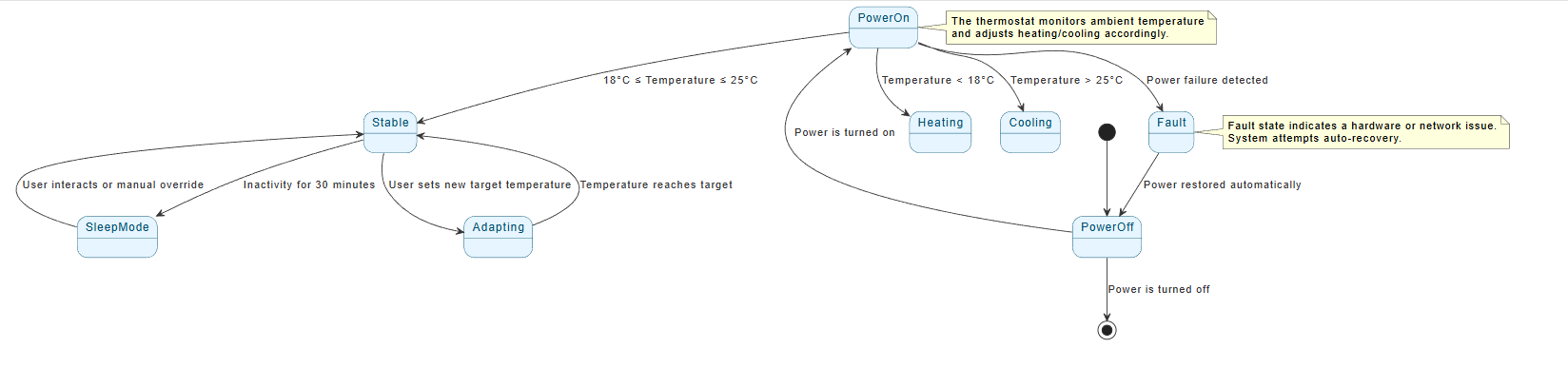 UML State Diagrams are essential tools for modeling the behavioral lifecycle of objects or systems that respond dynamically to events. This guide walks through a real-world example — a smart home thermostat — to demonstrate how to design, structure, and generate a correct, clear, and practical PlantUML State Diagram using industry best practices.